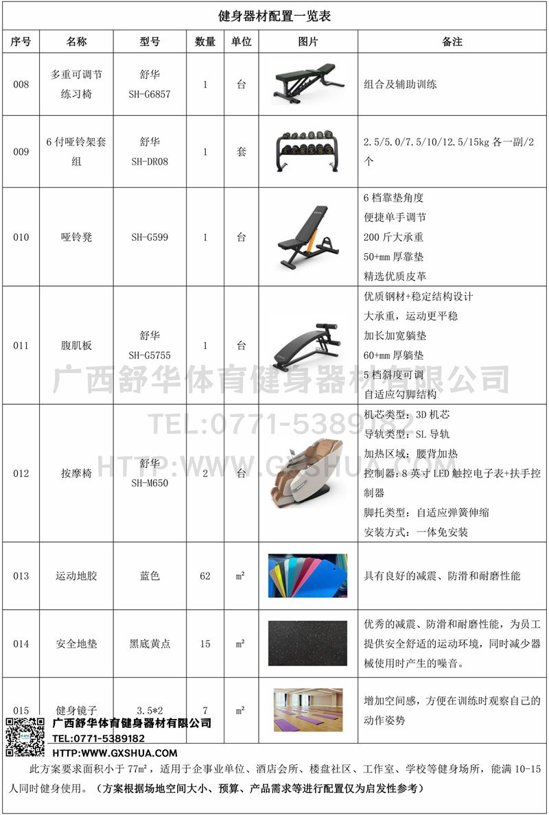 此方案要求面积小于77m²,适用于企事业单位、酒店会所、楼盘社区、工作室、学校等健身场所,能满10-15人同时健身使用。(方案根据场地空间大小、预算、产品需求等进行配置仅为启发性参考)