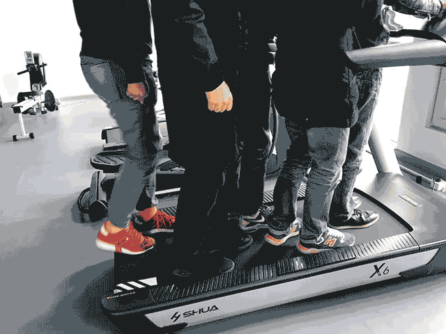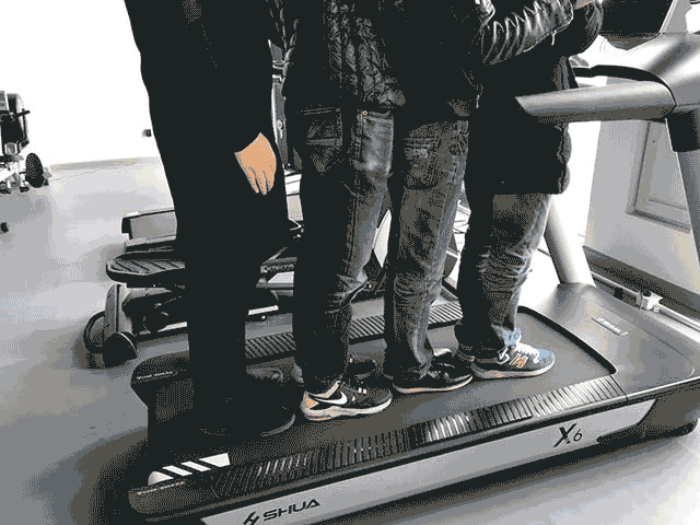 发现这台跑步机竟然根本无视于我们的体重,载着五个人毫无违和感(看上图)。  所以,你的体重如果超过200斤,在使用这台机器时,也可以放心蹦跶。