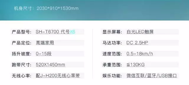 较大的跑带面积能让运动者带来舒适的运动跑感, 首先,我们先看一下官方给出的一些参数表